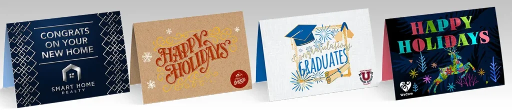 Celebrate any holiday, birthday, or special event with Greeting Cards—available in a variety of premium stocks and finishes. Add matching blank envelopes, gift card slits, or scoring options to maximize impact and results. Custom greeting cards offer a personal touch, strengthening connections and fostering a sense of warmth and appreciation in both personal and professional relationships.